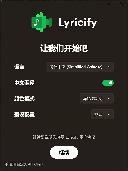 Client ID和Client Secret,点击确定即可。 - 继续完成登录,享受你的 Lyricify 之旅吧。